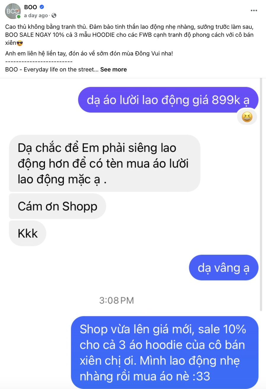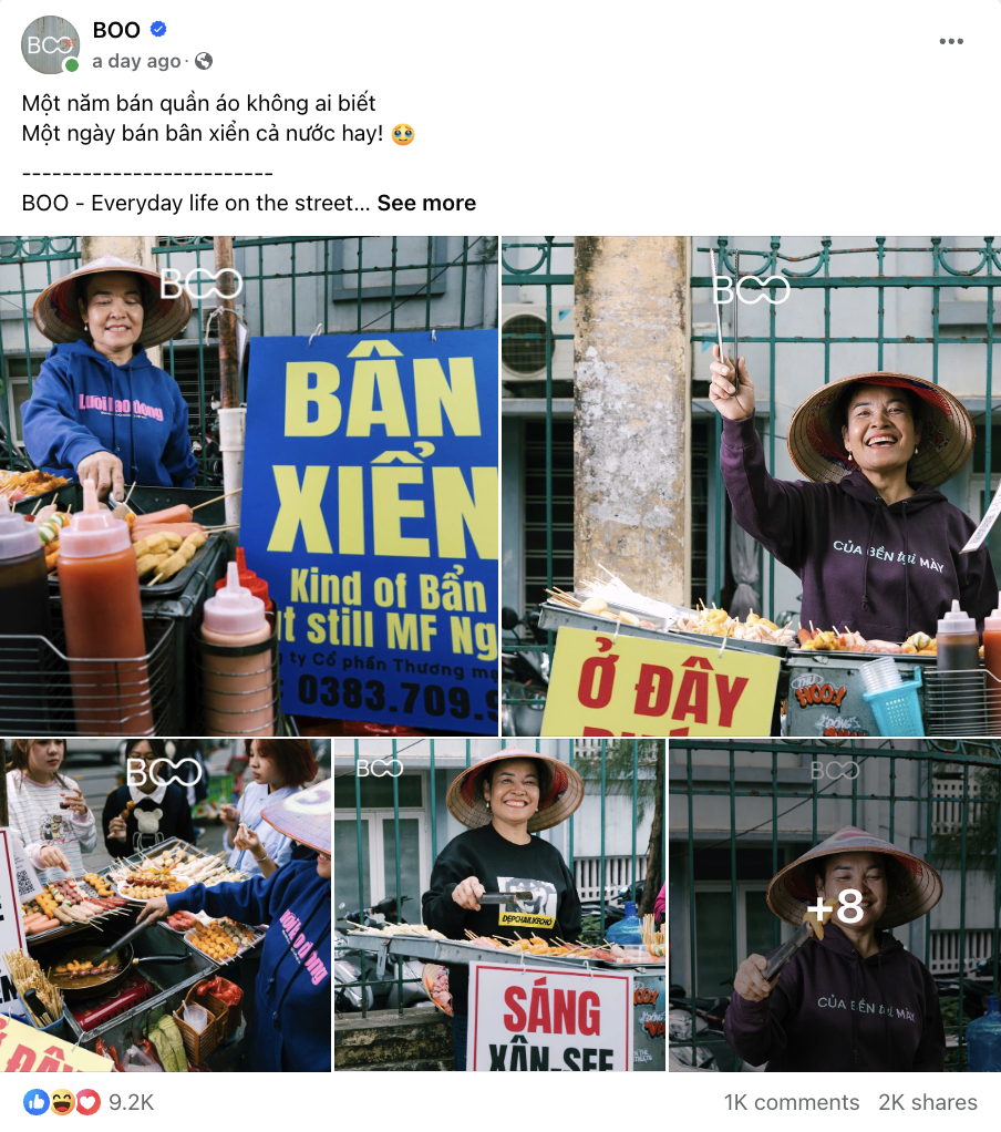 Trên fanpage của mình, bài đăng chính thức của BOO với dòng caption "Một năm bán quần áo không ai biết. Một ngày bán bân xiển cả nước hay!", đang thu về gần 10 nghìn lượt like, hàng nghìn bình luận và chia sẻ.