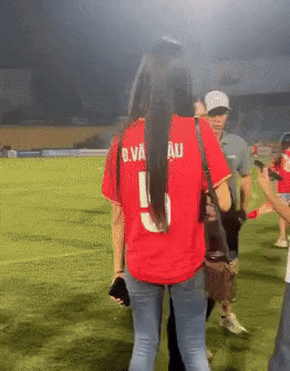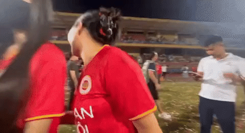 Trong khoảnh khắc khác, khi mẹ Văn Hậu đứng bế cháu trai chờ Văn Hậu kí tặng cổ động viên, Hải My cầm theo chiếc quạt nhỏ hướng về phía hai bà cháu giúp làm mát. Mẹ Văn Hậu cũng thoải mái tận hưởng sự chăm sóc của con dâu tương lai. Với chị dâu của Văn Hậu, Hải My cũng tự nhiên trò chuyện, nói cười. Cô nàng còn có động tác ôm vai chị dâu Văn Hậu, thể hiện mối quan hệ thân thiết.