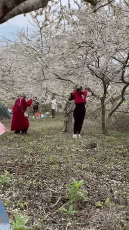 Theo dõi đoạn clip cho thấy, một cô gái trẻ đã đứng tại chỗ, bám tay vào cành mận rồi rung thật mạnh khiến hoa rơi lả tả khắp nơi. Cạnh đó, một người bạn đang ra sức tạo dáng để chụp được những bức ảnh đẹp nhằm sống ảo trên mạng xã hội.