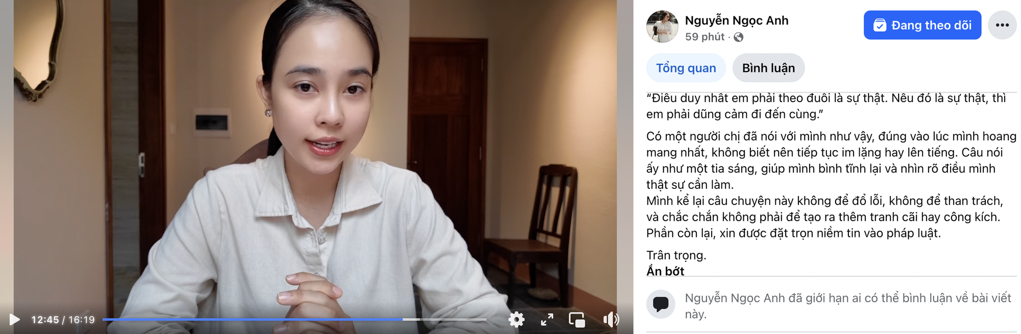 Đính kèm clip, Ngọc Anh ghi thêm chú thích rõ ràng. “Mình kể lại câu chuyện này không để đổ lỗi, không để than trách, và chắc chắn không phải để tạo ra thêm tranh cãi hay công kích. Phần còn lại, xin được đặt trọn niềm tin vào pháp luật” - là trích đoạn từ chú thích này.