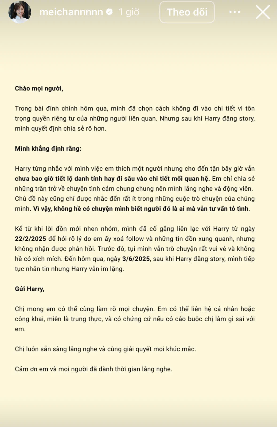 Cũng vì vậy, Meichan tiếp tục lên tiếng. Cô nàng nhắc thẳng tên Harry, thừa nhận cả hai có từng tâm sự về chuyện tình cảm nhưng không biết "nửa kia" mà Harry nhắc đến là ai. Ngoài ra, Meichan còn cho biết cô đã cố gắng liên lạc để mong muốn trao đổi trực tiếp nhưng đều không nhận được phản hồi từ Harry. Đáng chú ý hơn trước đó, khi nhận thấy Harry im lặng và hủy theo dõi mình trên MXH, Meichan đã chủ động hỏi thăm để tìm hiểu vấn đề nhưng đều bị đối phương "lơ đẹp".