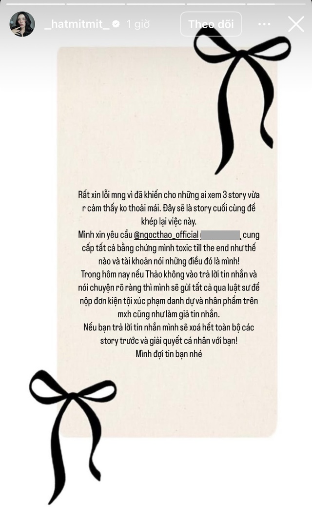 Cụ thể, Ngọc Thảo cho biết cô và Hạt Mít đã không gặp nhau 1 năm nay nhưng vẫn bị người bạn này “toxic”, nói xấu. Ngọc Thảo cũng bày tỏ cô đã giữ im lặng trong 6 tháng vừa qua, đọc hết những tin nhắn được cho là của Hạt Mít nhận xét không tốt về mình. Hot girl sinh năm 1990 còn thẳng thắn nói rằng nếu Hạt Mít không dừng lại, cô sẽ tiếp tục đăng tải toàn bộ lên MXH.