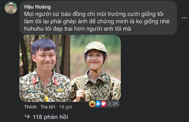 Trả lời phía dưới bức hình, Mũi trưởng Long đu theo cấu trúc bình luận của Hậu Hoàng: "Tôi còn xinh hơn người em của tôi nhé!". Màn đối đáp của cặp đôi nhận về rất nhiều lượt thả tim của dân tình.