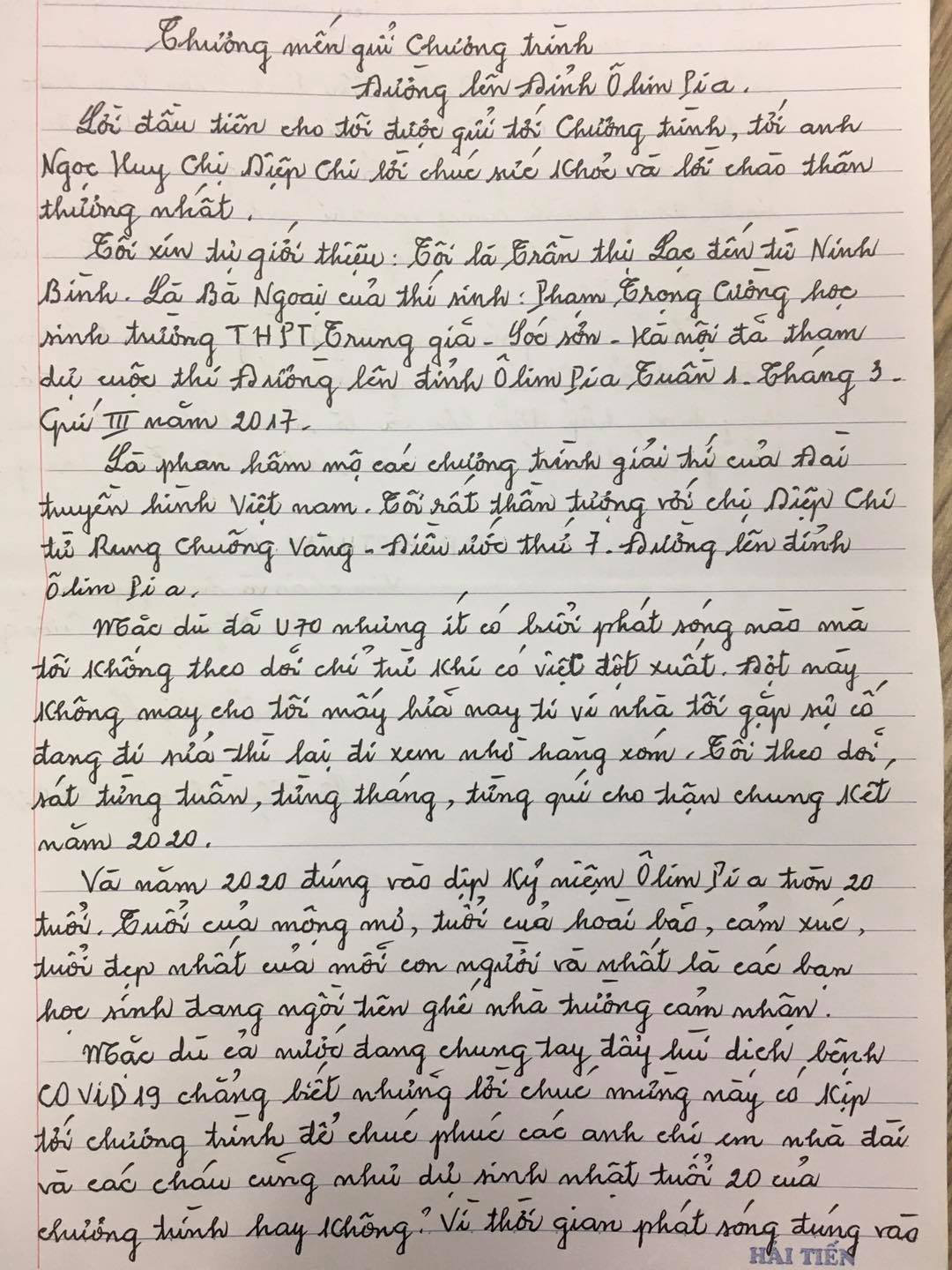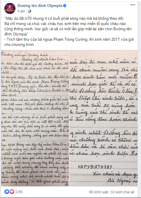 Mới đây trên fanpage Đường Lên Đỉnh Olympia đã đăng tải ảnh chụp bức thư tay của bà ngoại gửi cho chương trình khiến ai đọc cũng cảm thấy ấm áp.