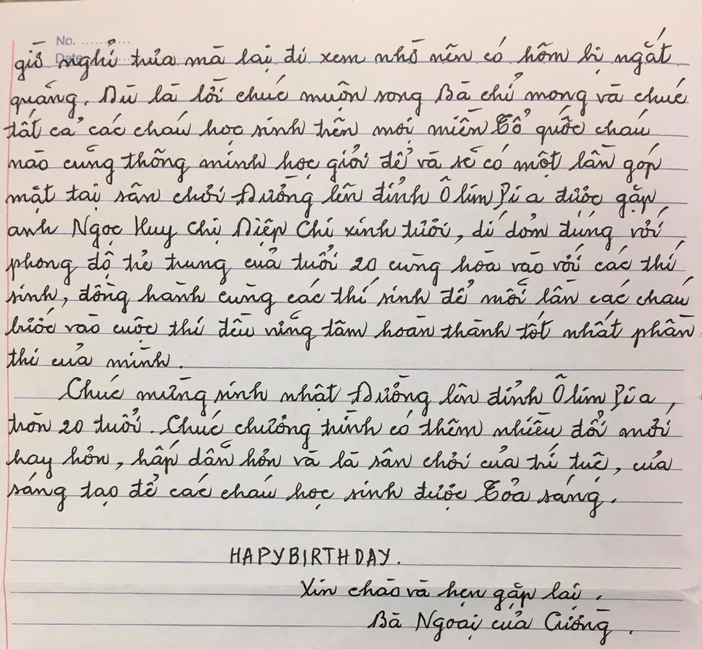 Lời chia sẻ thật thà của bà ngoại cựu thí sinh Trọng Cường khiến ai đọc cũng cảm thấy bà thật đáng yêu hết nấc! Cuối thư bà cũng không quên gửi tới chương trình lời chúc mừng sinh nhật tròn 20 tuổi: “Chúc mừng sinh nhật Đường Lên Đỉnh Olympia tròn 20 tuổi. Chúc chương trình có thêm nhiều đổi mới hay hơn, hấp dẫn hơn và là sân chơi của trí tuệ, của sáng tạo để các cháu học sinh được tỏa sáng.”