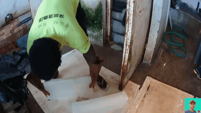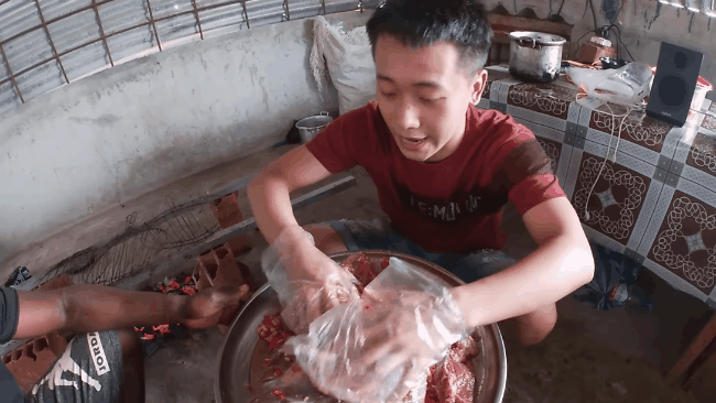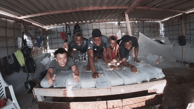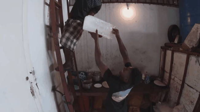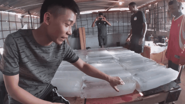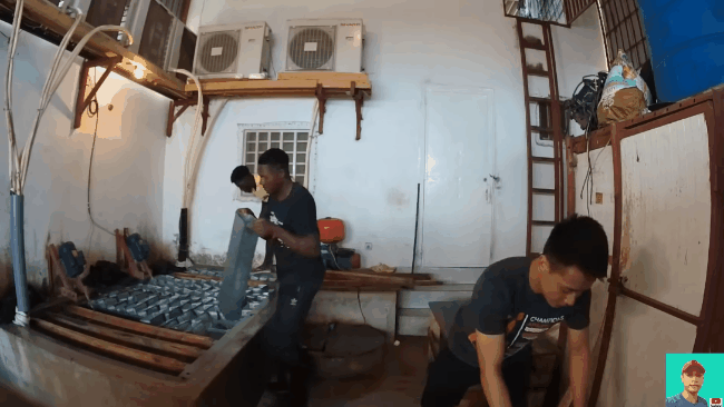 Khi đó chàng Youtuber đã nảy ra ý tưởng làm một chiếc "giường đá lạnh" để giúp cả team chống chọi trong "lò luyện" này. Và thế là anh cùng team bắt đầu mang từng tảng đá lạnh trong kho, lên trên tầng 2, xếp ngay ngắn trên giường.