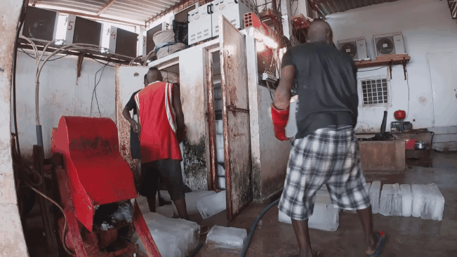 Công việc hàng ngày của Quang Linh Vlogs và team là làm đá lạnh, gỡ từng khay đá để vào kho bảo quản, sau đó đóng gói lại và giao cho khách. Xưởng đá nằm ngay sát bờ biển nên khách hàng mua đá là ngư dân, dùng đá để bảo quản hải sản sau khi được đánh bắt.