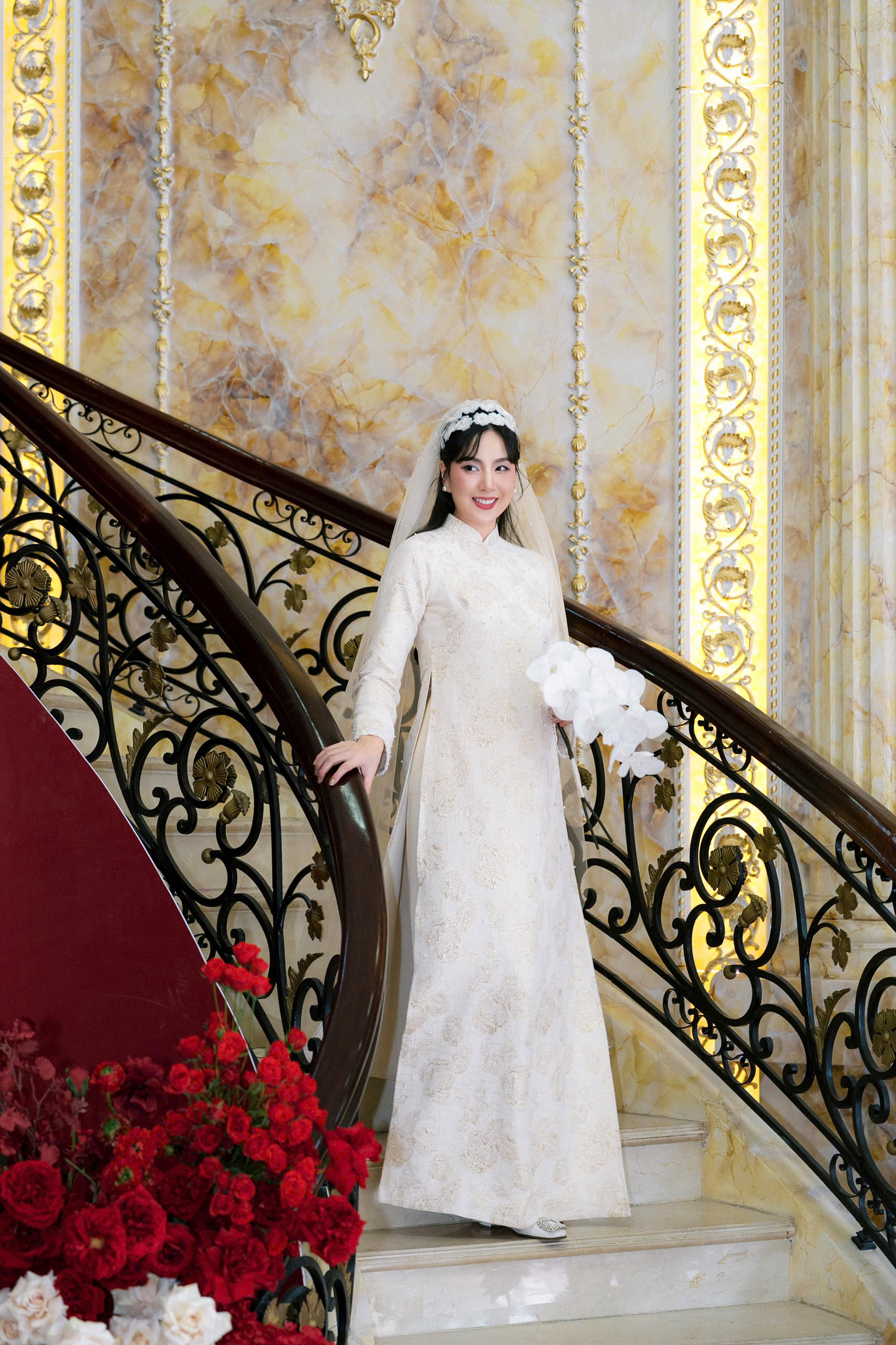 Bên trong căn biệt thự được trang trí sang trọng, tường nhà được chạm khắc tỉ mỉ thêm phần xa hoa. Ở sảnh còn có 2 lối cầu thang để di chuyển cũng đủ thấy độ bề thế của ngôi biệt thự. Trong lễ đón dâu, nhà chồng Mai Ngọc mang đến 9 tráp có lễ vật quen thuộc bao gồm đôi long - phụng, trái cây, bánh ngọt, rượu, trà... Những tráp cưới này được sắp xếp sang trọng, kết hợp với hoa tươi. Mai Ngọc cho biết mẹ chồng chính là người đích thân chuẩn bị những tráp cưới tinh tế, công phu này.