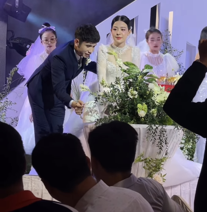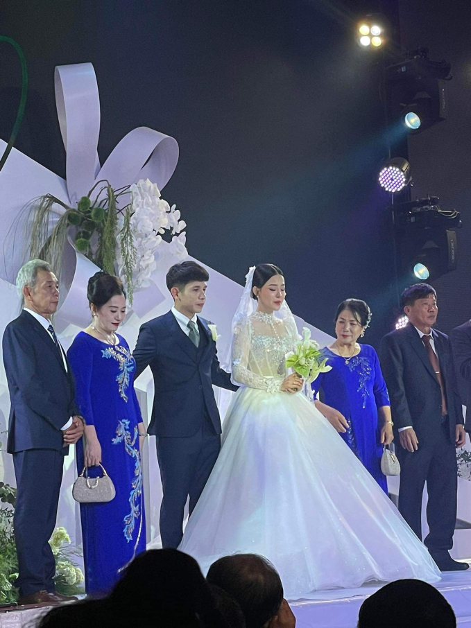 Đặc biệt, hội trường cưới đã lắng lại trong khoảnh khắc cô dâu và chú rể nắm tây nhau cùng bước vào lễ đường. Đây là cột mốc tuyệt vời, cái kết đẹp cho chuyện tình lãng mạn của chàng cầu thủ trưởng thành từ lò đào tạo HAGL và cô nàng thạc sĩ xinh đẹp được mệnh danh là "tiểu thư phố núi".