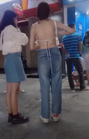 Điển hình như mới đây, một đoạn clip ngắn xuất hiện trên mạng xã hội ghi lại cảnh một cô gái trẻ đang đứng đợi rút tiền ở cây ATM cùng bạn mình. Đoạn clip sẽ chẳng có gì đáng xem nếu như không xuất hiện chiếc áo "mặc như không mặc" của cô gái trẻ.