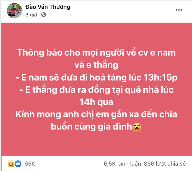 Theo đó, Nam Ok sẽ được hoả táng vào lúc 13:15, thành viên còn lại sẽ được an táng tại nghĩa trang quê nhà vào 14:00. Anh Văn Thường chia sẻ thông tin để anh chị em gần xa đến chia buồn cùng gia đình.
