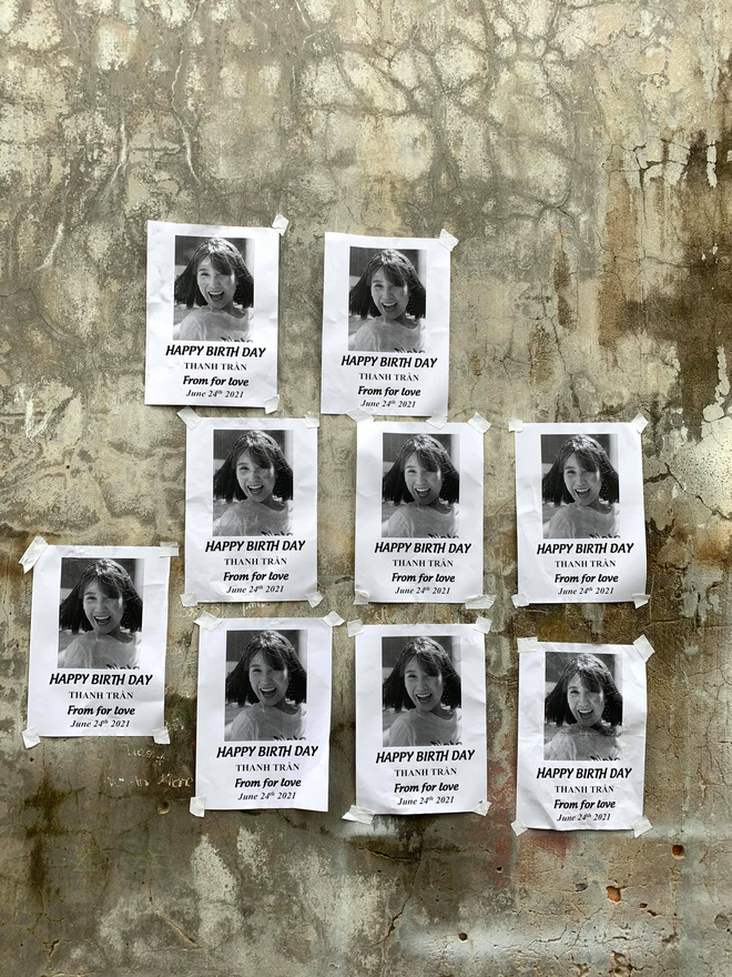 Mới đây, Thanh Trần đã đăng tải loạt ảnh được bạn thân chúc mừng sinh nhật theo cách vô cùng "bá đạo". Theo đó, hình ảnh bà mẹ 2 con cười tươi rói kèm lời chúc "Happy Birthday Thanh Trần From for love" được người bạn thân in ra và dán khắp mọi nơi từ cột điện, bảng đỗ xe, đường cấm, biển báo,...