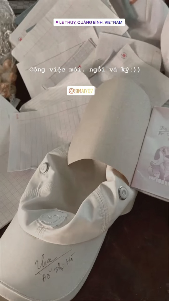 Trước sự ủng hộ nhiệt tình, Đỗ Hà đã ngồi ký rất nhiều lên cả giấy và mũ tặng các em. Cô nàng cũng hài hước thừa nhận bản thân viết chữ... khá xấu nên hi vọng các em học sinh sẽ không thấy thất vọng khi nhìn món quà.