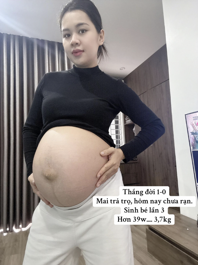 Ngày 12/1, nàng WAG Dương Thuỳ Phương - bà xã trung vệ ĐT Việt Nam Quế Ngọc Hải bất ngờ tung ra hình ảnh chân thực của bản thân trước khi vào phòng sinh con thứ ba. Với bụng bầu vượt mặt, cựu Hoa khôi đại học Vinh chia sẻ: "Thắng đời 1-0. Mai trả trọ, hôm nay chưa rạn. Sinh bé lần 3. Hơn 39 tuần, 3,7kg".