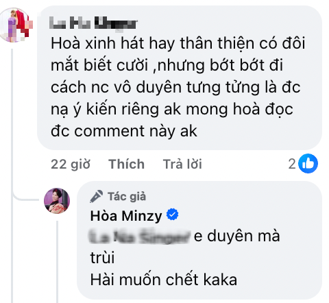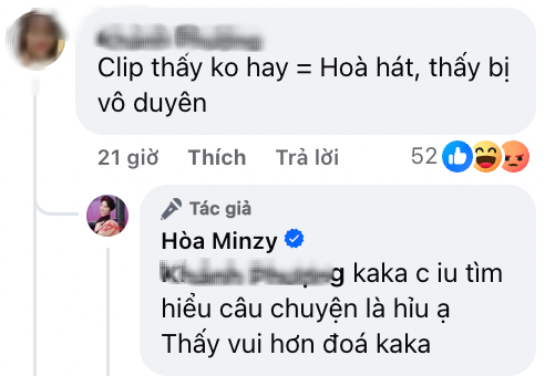 Không chọn cách im lặng hay né tránh, Hoà Minzy nhanh chóng phản hồi với thái độ nhẹ nhàng nhưng cũng rất rõ ràng. Nữ ca sĩ cho biết: "Chị yêu tìm hiểu câu chuyện là hiểu ạ. Thấy vui hơn đó", đồng thời hài hước "chốt hạ" bằng câu: "Em duyên mà trời. Hài muốn chết".