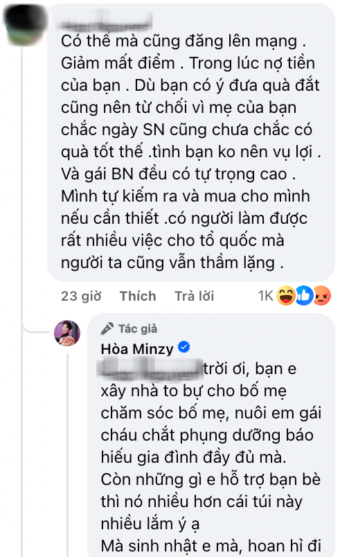 Cụ thể, trong dịp sinh nhật gần đây, Hoà Minzy đã nhận được một lời nhắn cực dễ thương từ Văn Toàn: "Thích gì thì mua đi, rồi trừ vào tiền nợ nhé". Không bỏ lỡ cơ hội, Hoà Minzy liền "chốt đơn" ngay chiếc túi Chanel mơ ước. Nữ ca sĩ cho biết cô không hề ngại ngùng khi nhận món quà này vì đó là tấm lòng chân thành từ người bạn thân thiết, và cũng là cách Văn Toàn thể hiện sự quan tâm tới cô trong ngày sinh nhật. Thực tế, Hoà Minzy hiện vẫn còn đang nợ Văn Toàn một khoản tiền lớn – từng vay mượn để đầu tư sản xuất MV ca nhạc. Số tiền mua túi Chanel lần này được trừ thẳng vào tiền nợ khiến dân tình "chỉ biết ước", mong có được bạn thân kiên chủ nợ hào phóng như Văn Toàn.