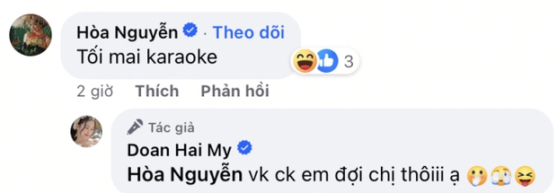 Trong đó có vợ chồng hậu vệ Đoàn Văn Hậu và Top 10 Hoa hậu Việt Nam 2020 Doãn Hải My. Để bày tỏ lòng cảm ơn với sự ủng hộ nhiệt tình của Doãn Hải My, Hoà Minzy đã để lại bình luận rủ nàng WAG "tối mai karaoke". Đáp lại, bà xã Văn Hậu khẳng định "vợ chồng em đợi chị thôi ạ".