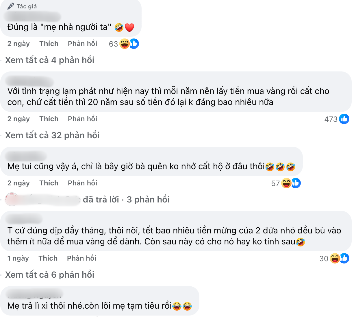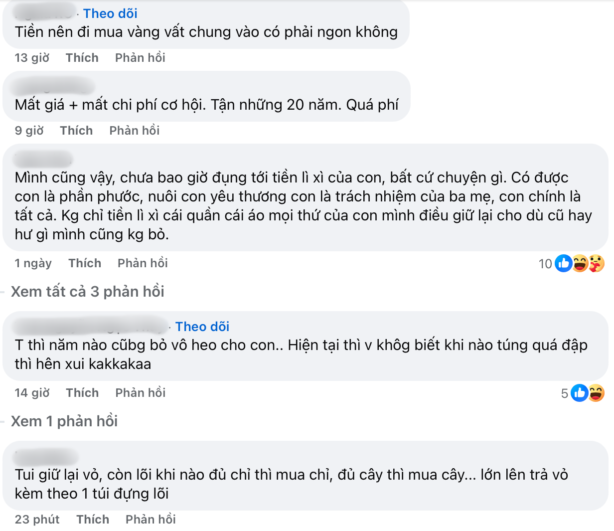 Tuy nhiên, cũng nhiều người cho rằng tiền này để không cũng khá lãng phí, nếu mẹ tích cóp mua vàng thì có lẽ giờ giá trị cũng sẽ tăng lên. Dẫu vậy, đây chỉ là ý kiến cá nhân, quan trọng nhất vẫn là chữ tín, nói lời giữ lời mà người mẹ đã làm.