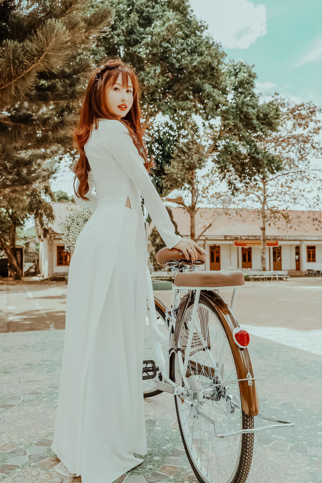 Ngoài ra, bà xã Minh Nhựa còn chia sẻ đầy đủ bộ ảnh mới đồng thời chia sẻ kỷ niệm vui chuyện mình là học sinh cá biệt thời còn đi học: "Quậy quá rách cái ống quần luôn. Áo dài mới may, mặc được có tẹo chụp hình là rách rồi đó. Ngày xưa cũng toàn bị rách giờ cũng y chang. Mà nay quậy hơn tuổi học trò luôn rồi".