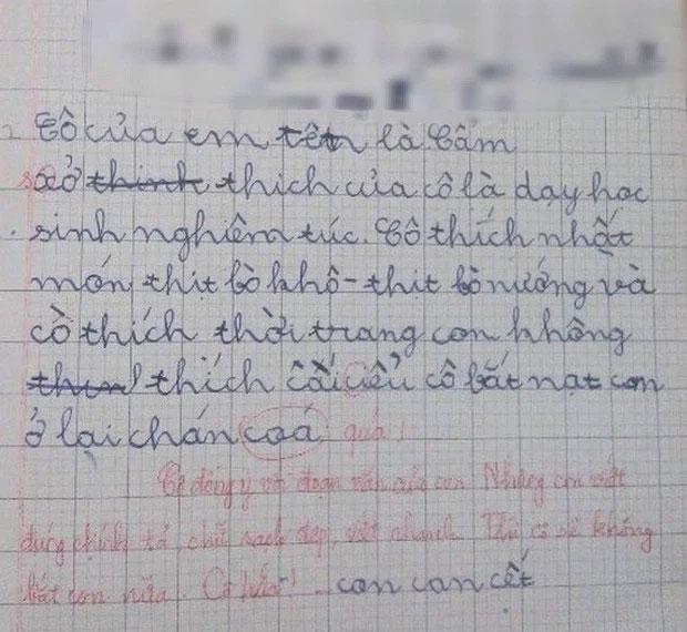 "Cô của em tên là Cẩm. Sở thích của cô là dạy học sinh nghiêm túc. Cô thích nhất món thịt bò khô, thịt bò nướng và cô thích thời trang. Con không thích cái kiểu cô bắt nạt con ở lại. Chán quá!".