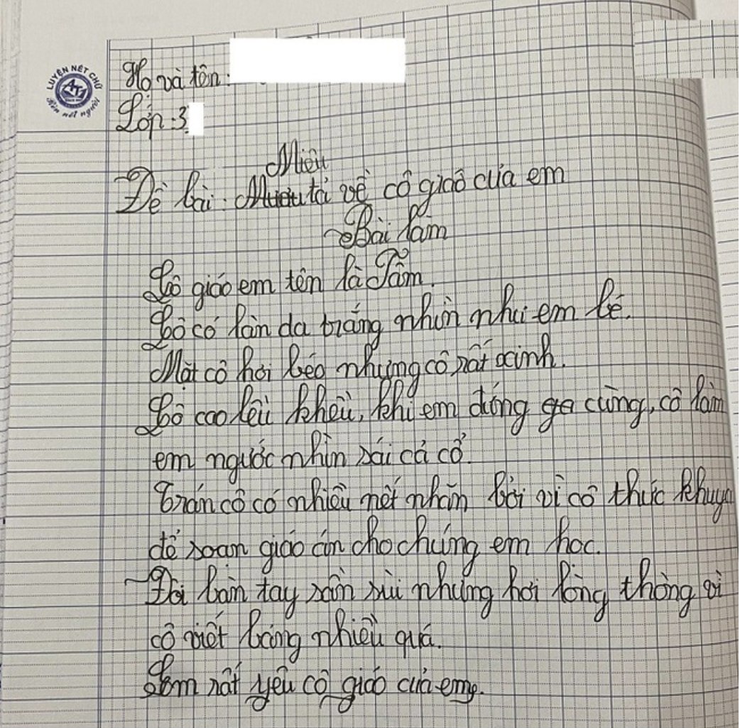 Cụ thể, cậu nhóc này viết: "Cô giáo em tên là Tâm. Cô có làn da trắng mịn như da em bé. Mặt cô hơi béo nhưng rất xinh. Cô cao lều khều, khi em đứng cùng cô làm em ngước nhìn sái cả cổ. Trán cô có nhiều nếp nhăn bởi vì cô thức khuya để soạn giáo án cho chúng em học. Đôi bàn tay sần sùi nhưng hơi lòng thòng vì cô viết bảng nhiều quá. Em rất yêu cô giáo em".