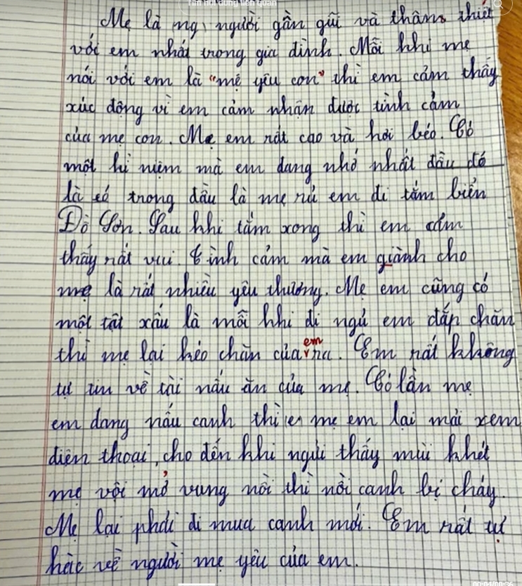 “Cứ 10 bạn thì phải có đến 9 bạn sẽ tả, kể về mẹ khi cô giáo ra đề bài nói về người em yêu quý nhất trong gia đình”, một netizen chia sẻ. Và cô bé là chủ nhân của bài văn dưới đây cũng không ngoại lệ. Bài văn được một giáo viên tiểu học đăng tải lên mạng xã hội TikTok, dành lời khen ngợi học sinh, những câu từ gần gũi, vô tư và hồn nhiên nhưng chứa đựng nhiều tình cảm dành cho mẹ.