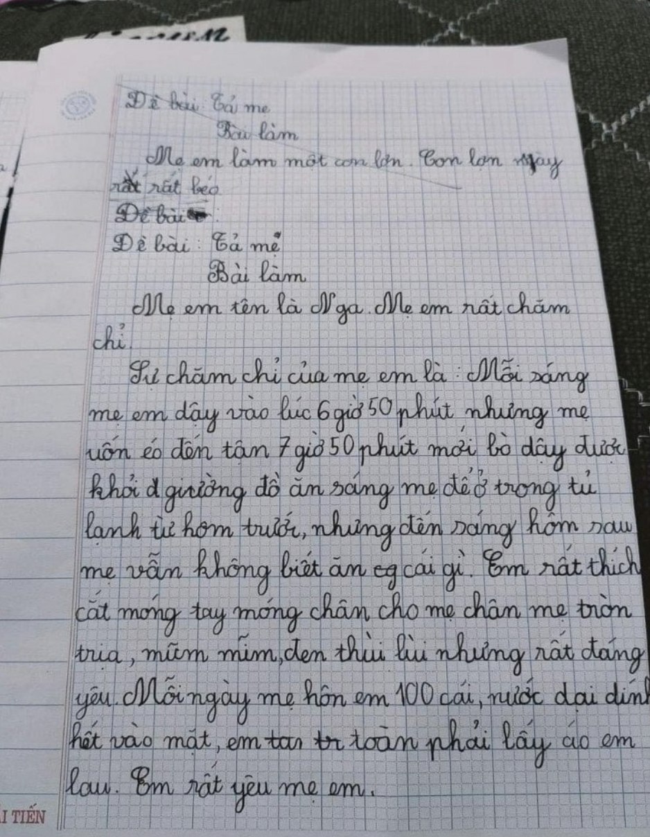 Trong bài viết cậu nhóc này miêu tả không xót điểm xấu nào của mẹ như "Mẹ đã dậy vào lúc 6 giờ 50 nhưng mẹ uốn éo đến tận 7 giờ 50 phút mới bò dậy", "chân mẹ đen thùi lùi",.... Nhưng kết bài, cậu nhóc vẫn không quên "nịnh" mẹ bằng câu nói: "Em rất yêu mẹ mình" khiến cư dân mạng và giáo viên đọc bài mà không ngừng cười được.