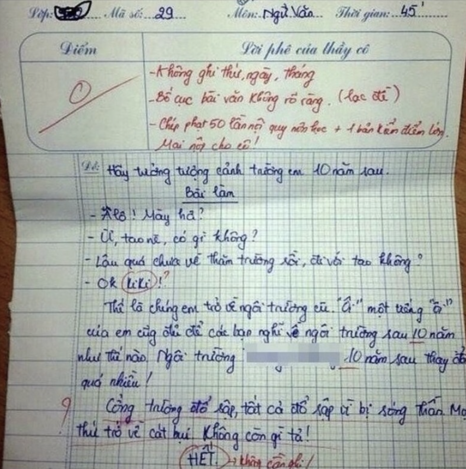 Đọc bài văn của cậu học trò, giáo viên đã thẳng tay chấm 0 điểm cùng với lời nhận xét: "Không ghi thứ ngày tháng; Bố cục bài văn không rõ ràng (lạc đề); Chép phạt 50 lần nội quy môn học + 1 bản kiểm điểm lớn. Mai nộp cho cô".