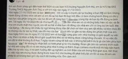 Theo đó, học sinh T. cho biết học lớp 8A5 ở một trường THCS tại quận 12. Học sinh này tố bị bạn cùng lớp có hành động bạo lực lên cơ thể mình. Ngoài ra, T. còn tuyên bố sẽ không đến trường sau khi bị mẹ của bạn học (tên là M.) tìm đến tận nhà la mắng, tác động vật lý.