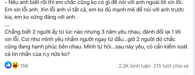 Giờ hai người đó chắc cũng đang hạnh phúc bên nhau. Mình tự hỏi sau này yêu, có cần kiểm soát cả tin nhắn của người yêu nữa không?”.