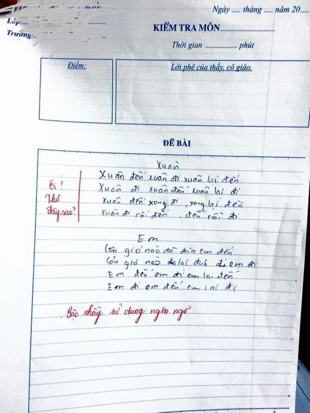 Bên cạnh 2 bài thơ tựa đề là "Xuân" và "Em" của bạn học sinh lớp 8 này, cô giáo đã để lại lời phê ngay: "Ôi, thơ đây sao? Bậc thầy sử dụng ngôn ngữ". Một số thầy cô khác hài hước hơn, cho rằng: "Nhận ra hai bài thơ của em chạm tới hai quy luật. Bài 1 là quy luật về sự tuần hoàn vĩnh hằng của thiên nhiên trong dòng thời gian. Bài 2 là quy luật về sự thất thường vĩnh hằng của lòng người trong dòng thời gian (phái mảnh mai có thể tuỳ ý thay 'em' thành 'anh' là có một tổng kết khá chuẩn xác về tình yêu)".