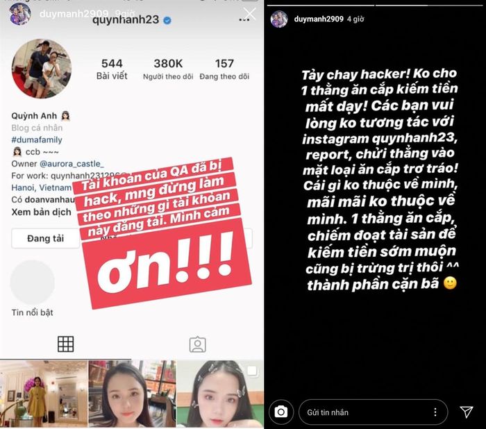 Có thể thấy sự bức xúc của Duy Mạnh qua loạt story trên trang cá nhâ của anh chàng, may mắn là sau đó Quỳnh Anh đã lấy lại được tài khoản.