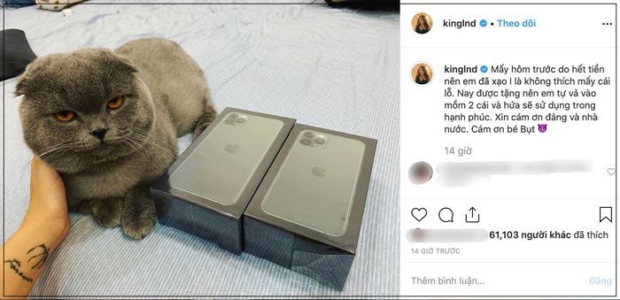 Mới đây, Linh Ngọc Đàm đã khiến dân tình ganh tỵ đến ”lác mắt” khi khoe một cặp iPhone 11 mới cứng kèm caption hài hước: “Mấy hôm trước do hết tiền nên em đã xạo là không thích mấy cái lỗ. Nay được tặng nên em tự vả vào mồm 2 cái và hứa sẽ sử dụng trong hạnh phúc. Cám ơn bé Bụt”.