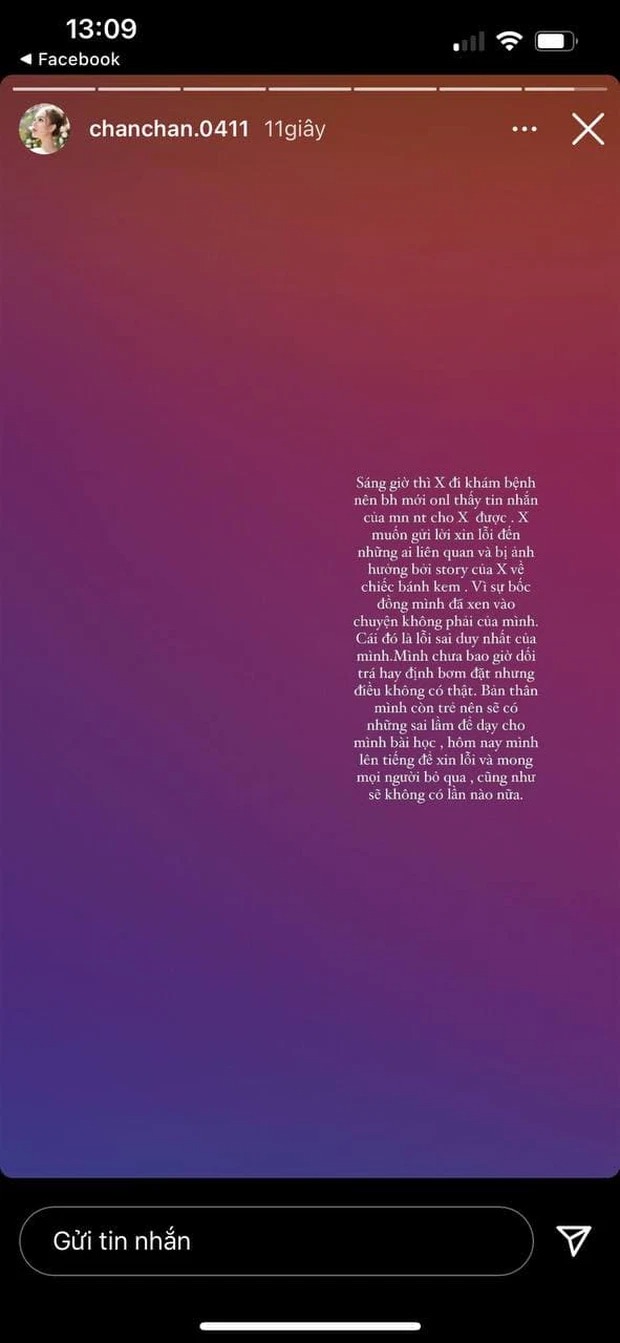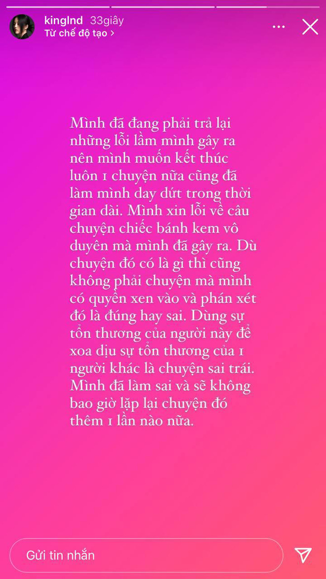 "Mình đã phải trả lại những lỗi lầm mình gây ra nên mình muốn kết thúc luôn 1 chuyện nữa cũng đã làm mình day dứt trong thời gian dài. Mình xin lỗi về câu chuyện chiếc bánh kem vô duyên mà mình đã gây ra.