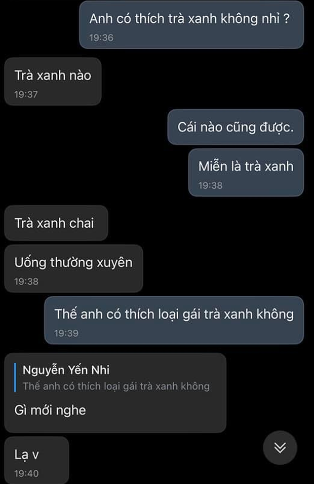 Không biết anh chàng này có biết nghĩa bóng của từ "trà xanh" đang được lan truyền không nhưng đáp án anh chàng đưa ra hẳn đã làm cô bạn gái vui lắm