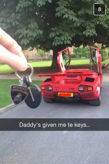 Chỉ cần đăng nhập Facebook và gõ dòng chữ "Rich Kids of Snapchat" vào ô tìm kiếm, click vào và bạn sẽ ngay lập tức bị choáng bởi những hình ảnh siêu xe, đồng hồ đắt tiền, hàng hiệu ngập tràn được chia sẻ ở đó. Các cậu ấm, cô chiêu trong hội con nhà giàu Snapchat chính là chủ nhân của những bức hình đó. Xem qua một lượt album, bạn sẽ phải gật gù rằng độ chịu chơi và cuộc sống sang chảnh của họ không hề thua kém bất cứ một hội con nhà giàu nào trên thế giới cả, và thậm chí còn có phần "nhỉnh" hơn.