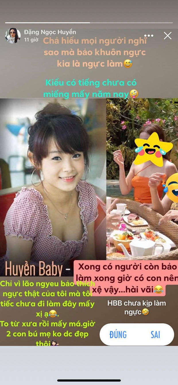 Trước những nghi án của netizen, Huyền Baby nhanh chóng lên tiếng phủ nhận, cô cho biết mình không "trùng tu" vùng ngực bởi chồng chỉ thích khuôn ngực tự nhiên của mình.