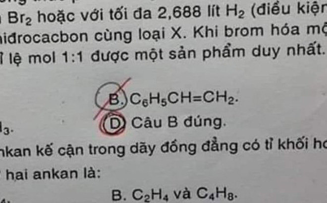 Cụ thể, trong đề kiểm tra trắc nghiệm mà cô đưa ra cho học sinh của mình xuất hiện một phần đáp án cực lầy lội mà nếu không tỉnh thì chắc chắn, số người trả lời sai sẽ không hề ít. Trong khi đáp án B đưa ra câu trả lời cụ thể thì ở đáp án D lại là "câu B đúng".