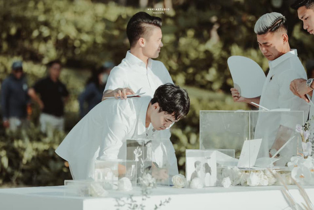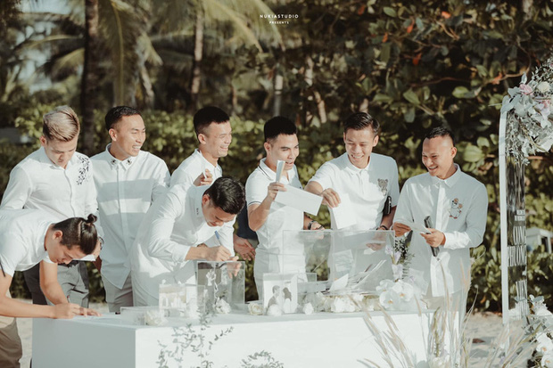 Trong ảnh, ai cũng vui cười hớn hở, Đức Huy, Hải Quế, Trọng Hoàng đang làm động tác bỏ phong bì vào hòm, Nguyên Mạnh, Minh Long còn cặm cụi viết lời chúc mừng. Hội cầu thủ vô cùng vui vẻ, thoải mái trong ngày cưới Phượng - Minh. Đặc biệt, sau dòng chia sẻ của Đức Huy, nhiều người cũng ước đoán số tiền mà hội cầu thủ mừng đám cưới chắc chắn không nhỏ.