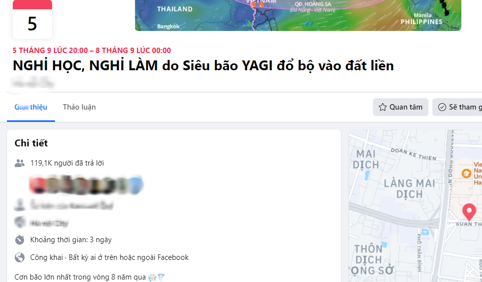 Trên mạng xã hội Facebook, sự kiện trực tuyến mang tên “Nghỉ học, nghỉ làm do siêu bão Yagi đổ bộ vào đất liền” đang thu hút hơn 122 nghìn lượt quan tâm và tham gia.