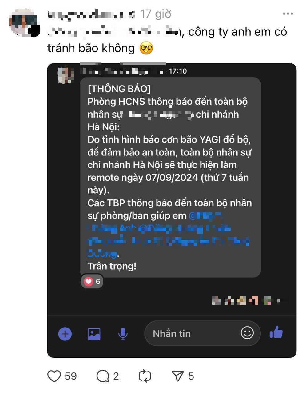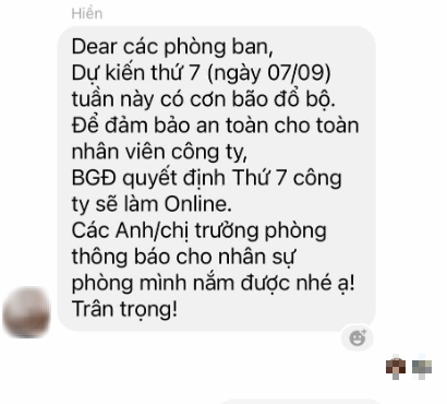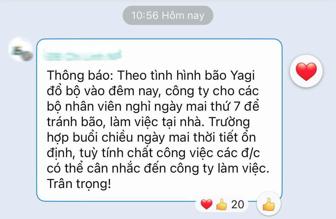 "Sau khi đọc báo, tham khảo thông tin trên mạng xã hội, mình biết được đây là một cơn bão rất lớn. Thế nên, việc nghỉ làm, nghỉ học cũng là yêu cầu chính đáng của nhiều người, thể hiện sự quan tâm của các công ty, tổ chức... dành cho người trẻ, nhân sự của mình trong lúc này”, chủ tài khoản A.H chia sẻ.