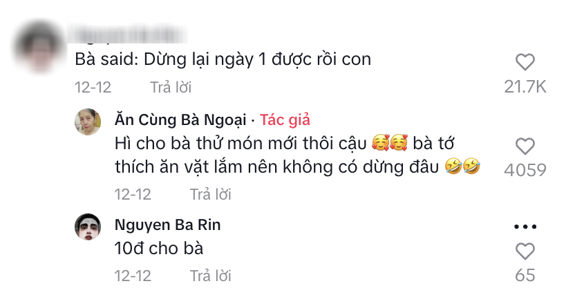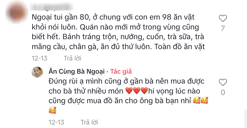 Với 13 đoạn clip là khoảnh khắc bà ngoại nhâm nhi 13 món ăn khác nhau trong seris 100 ngày ăn uống của bà, kênh TikToke "Ăn cùng bà ngoại" đã nhận về hơn 400 nghìn lượt yêu thích. Tất cả mọi người đều dành lời chúc sức khỏe đến bà, và cảm nhận được tình cảm ấm áp của chủ nhân kênh TikTok và người bà của mình. Thậm chí có người còn gợi ý thêm các món ăn mới để cô chuẩn bị cho bà nếm thử.