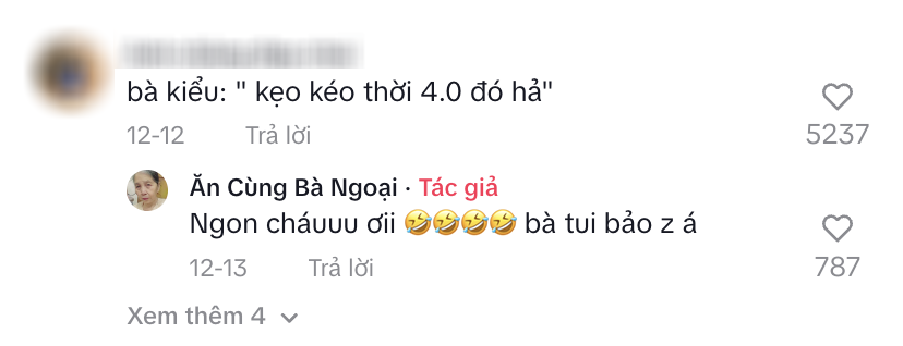 Ngoài những clip ghi khoảnh khắc bà ngoại thưởng thức món ăn, chủ nhân kênh TikTok cũng chia sẻ thêm: "Bà mình luôn ăn đủ 3 bữa và có bổ sung thực phẩm bồi bổ sức khỏe mỗi ngày. Những món như này bà chỉ thi thoảng mới ăn như một món ăn vặt thôi.