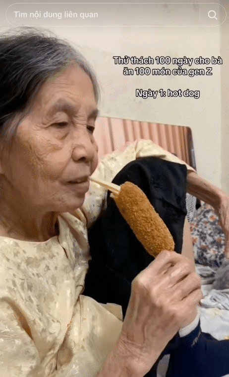 Đoạn clip bà ngoại ăn hotdog khởi động cho series "Ăn cùng bà ngoại" của bạn TikToker này. Chủ nhân kênh TikTok chia sẻ với một chú thích cực kỳ đáng yêu: "Ngày 1/100: Hôm nay bà ngoại mình ăn thử hot dog, bà bảo ngon lắm cháu ạ, nhưng để bụng tối còn ăn cơm".