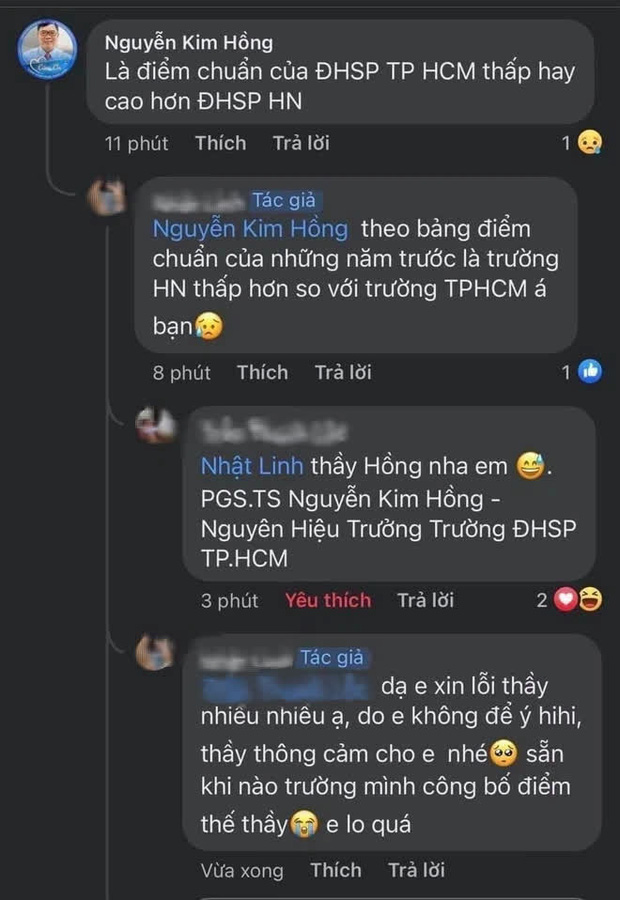 Phút mốt sau, một thầy giáo thấy bài đăng và bình luận trên đã vào đính chính một thông tin khiến nữ sinh không khỏi hoảng hốt. Theo đó, nhân vật "người lạ" hỏi han điểm chuẩn mà cô nàng bắt gặp hóa ra là nguyên Hiệu trưởng của ngôi trường mình sắp theo học - PGS -TS. Nguyễn Kim Hồng.