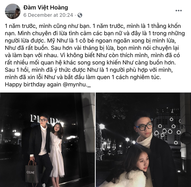 "Một năm trước, mình chuyên đi lừa tình cảm các bạn nữ và đây là một trong những người lừa được. Mỹ Như là một cô bé ngoan ngoãn xong bị mình lừa, Như đã rất buồn. Sau hơn vài tháng bị lừa, bọn mình nói chuyện lại và làm bạn với nhau. Vì không biết Như còn thích mình, mình đã có rất nhiều mối quan hệ khác song song khiến Như càng buồn hơn. Sau một hồi, mình đã ý thức được Như là người phù hợp với mình, mình đã xin lỗi Như và bắt đầu làm quen một cách nghiêm túc", nam chính tên Đàm Việt Hoàng chia sẻ trong bài đăng siêu hot.