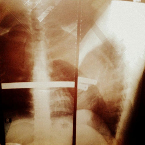 Dù rất đau lòng nhưng để giữ mạng sống cho con trai, gia đình anh chấp nhận phẫu thuật, chèn thanh sắt dài 30,5 cm trong lồng ngực Khánh. Suốt 3 năm qua, dù chung sống với "vật thể lạ" trong người nhưng 9X luôn động viên mình vượt qua.