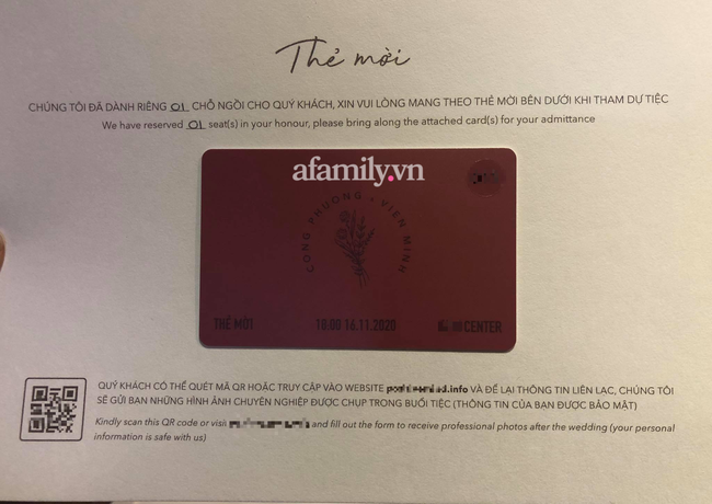 Đặc biệt nhất, độ bảo mật của đám cưới được yêu cầu ở mức rất cao. Công Phượng, Viên Minh ghi rõ ràng trên thiệp mời về số lượng khách: "Chúng tôi đã dành riêng 01 chỗ ngồi cho quý khách". Không chỉ vậy, đi kèm mỗi thiệp là một tấm thẻ từ để đảm bảo bảo mật của đám cưới.