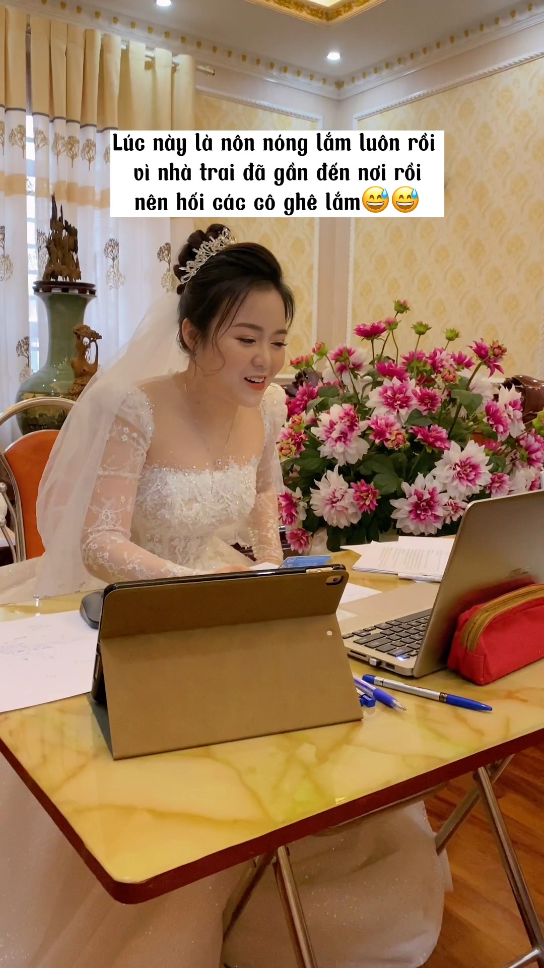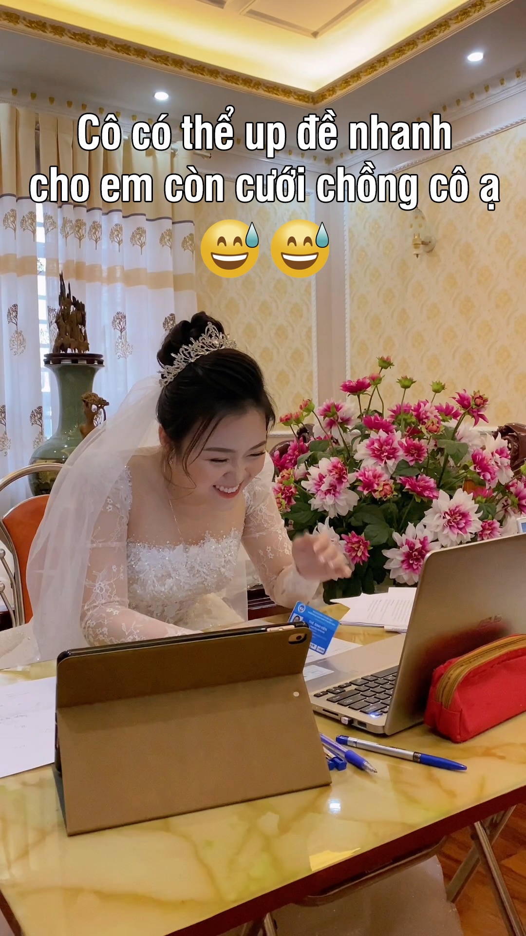 Mới đây, một sự kiện xảy ra tại lễ cưới đang khiến dân tình vô cùng xôn xao nhưng khi biết rõ ngọn nguồn thì không khỏi thích thú. Cụ thể, ngay trong ngày cưới, nhưng cô dâu dù đã trang điểm kĩ càng vẫn không kịp giờ làm lễ. Hỏi ra mới biết, hóa ra cô gái xinh đẹp đang phải tham dự một buổi thi online.