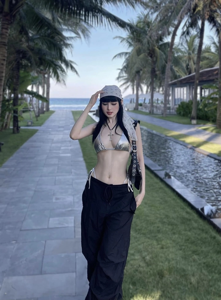 Mới đây, Tâm Tít đã khiến người hâm mộ của mình được một phen "bỏng mắt" với loạt ảnh check-in tại một resort cùng bộ bikini được mix match khéo léo. Theo đó, cô diện bikini màu xám bạc, kết hợp với quần đen thụng cá tính. Bộ trang phục giúp cô không chỉ kín đáo vừa đủ, mà còn tôn lên những thế mạnh hình thể của hot girl. Đặc biệt, làn da trắng sứ của Tâm Tít cũng trở nên nổi bật hơn.